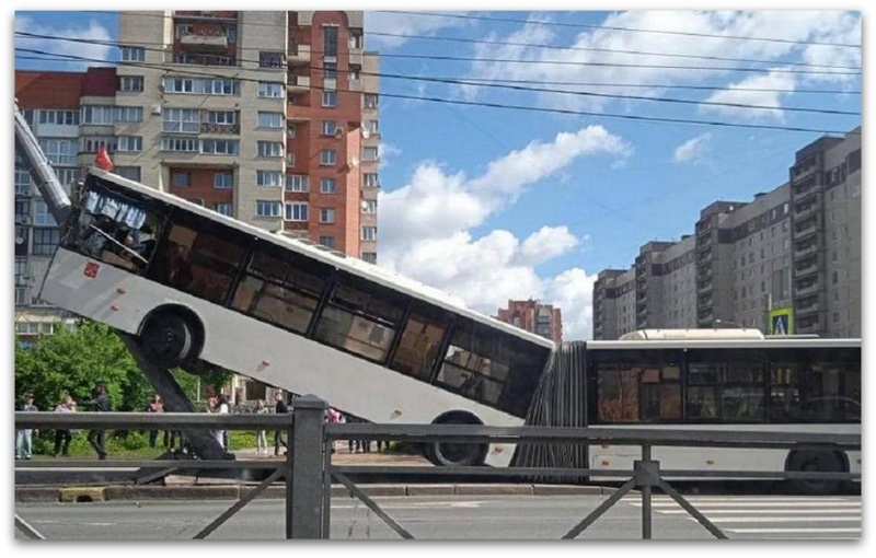 Во сообраќајна несреќа во Санкт Петербург автобус налета на бандера, се исправи и остана во таа положба.