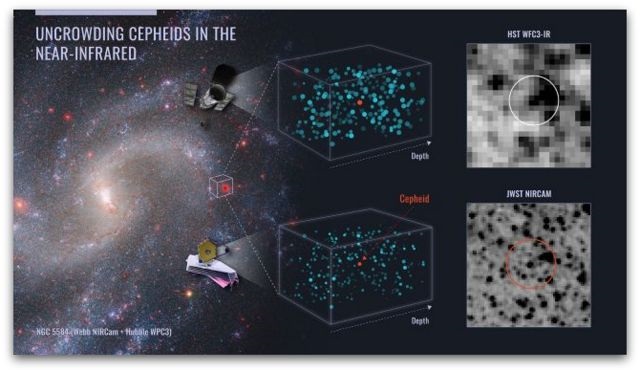 Променливите на цефеидите се златна стандардна алатка за мерење на растојанија до галаксиите оддалечени милиони светлосни години, што е клучно за одредување на Hubble константа, објаснува астрономот Adam Riess. Сепак, добивањето точни податоци за променливите на Cepheid е предизвик, особено затоа што ѕвездите во далечните галаксии често се појавуваат блиску една до друга.