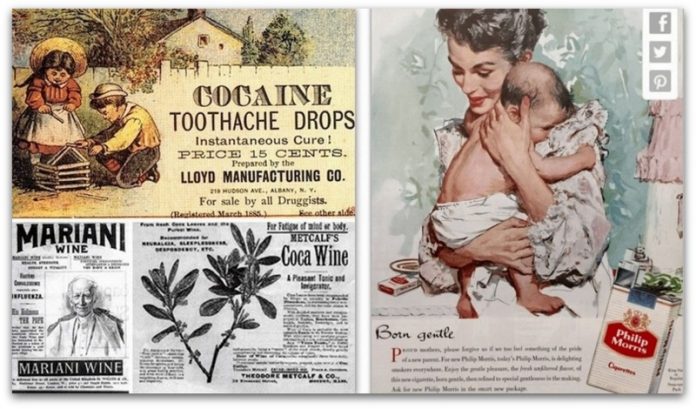 Пред 100 години, луѓето не го сметале кокаинот за штетен. Напротив, тој бил достапен во аптеките и се продавал без рецепт за лекување на кашлица и на забоболка. Исто така кокаинот бил препорачуван како седатив за децата. Како и другите лекови, и кокаинот бил рекламиран.
